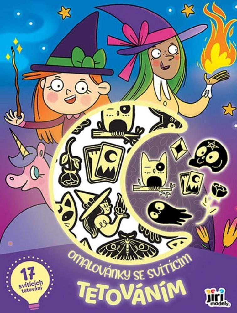 Omalovánky obsahují 16 barevných stran s obrázky k vybarvení a list originálních tetovaček, které ve tmě svítí.