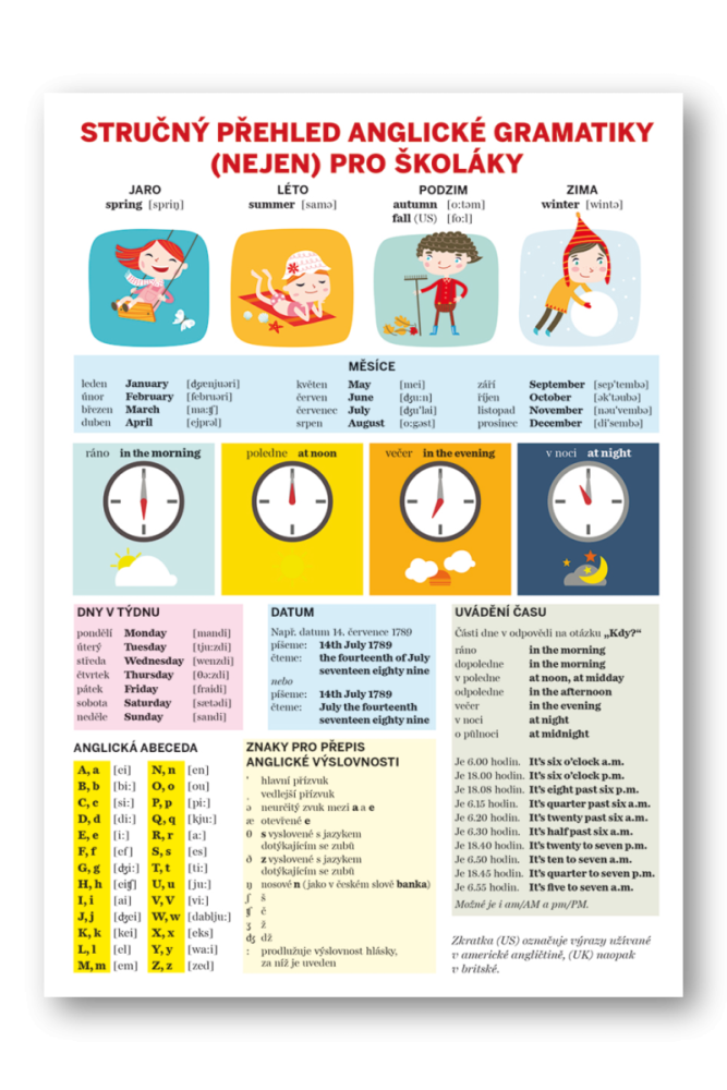 Anglická gramatika v kostce. I tak lze nazvat tento stručný, ucelený a přehledně uspořádaný souhrn anglické gramatiky. Počínaje abecedou, předložkami in, on, at, základními a řadovými číslovkami a znaky pro přepis anglické výslovnosti přes dny v týdnu, měsíce, uvádění času, data, roční období, ale i výrazy pro množství, množné číslo podstatných jmen, členy, osobní a přivlastňovací zájmena a nejužívanější frázová slovesa, vztažná a tázací zájmena až po stupňování, časování, způsobová a nepravidelná slova, podmiňovací způsob a mnoho dalšího - zkrátka zde naleznete vše, co je pro osvojení gramatiky anglického jazyka nezbytné. Jednotlivé informace jsou přehledně uspořádány a gramatické jevy uvedeny na příkladech tak, abyste měli při studiu angličtiny vždy po ruce pohotového a užitečného pomocníka.