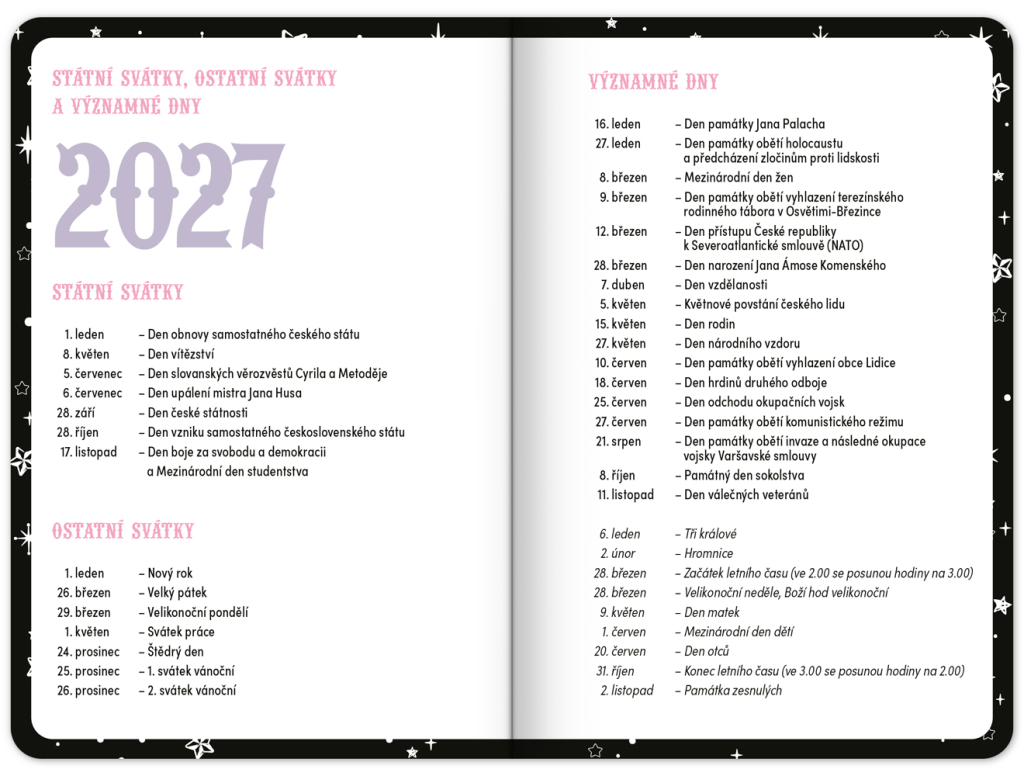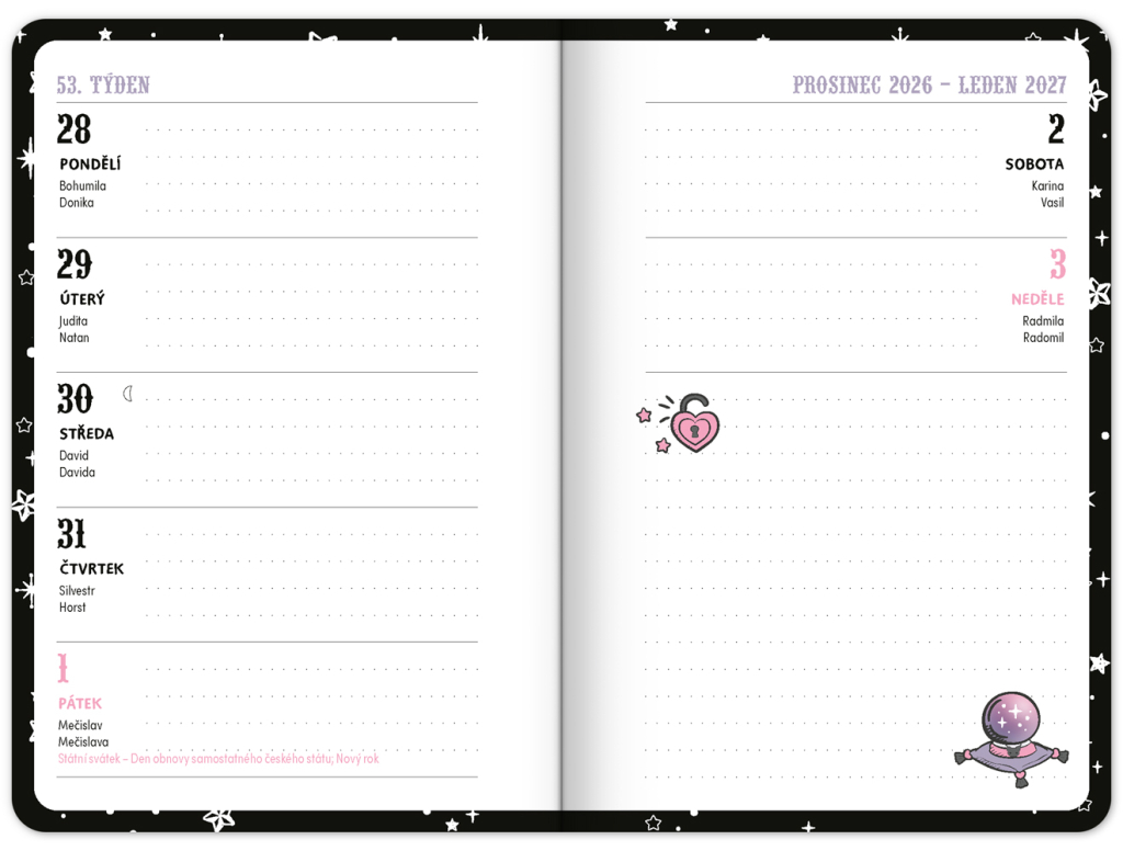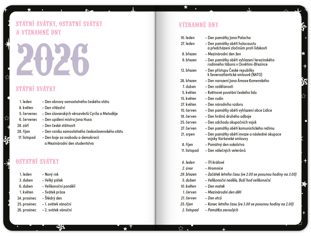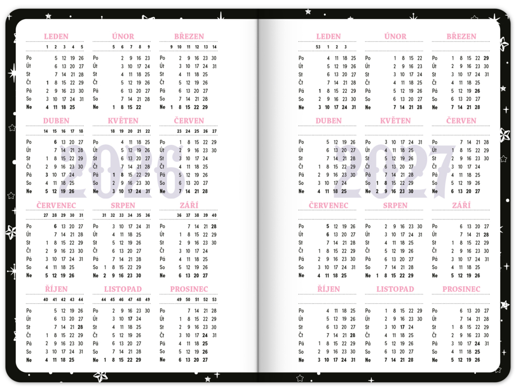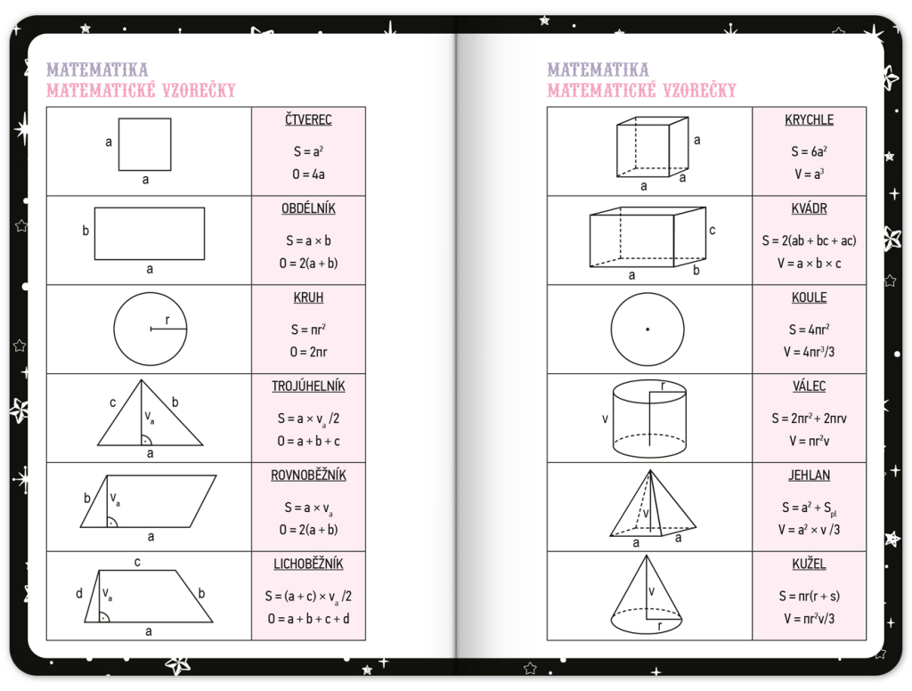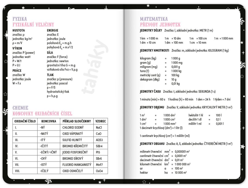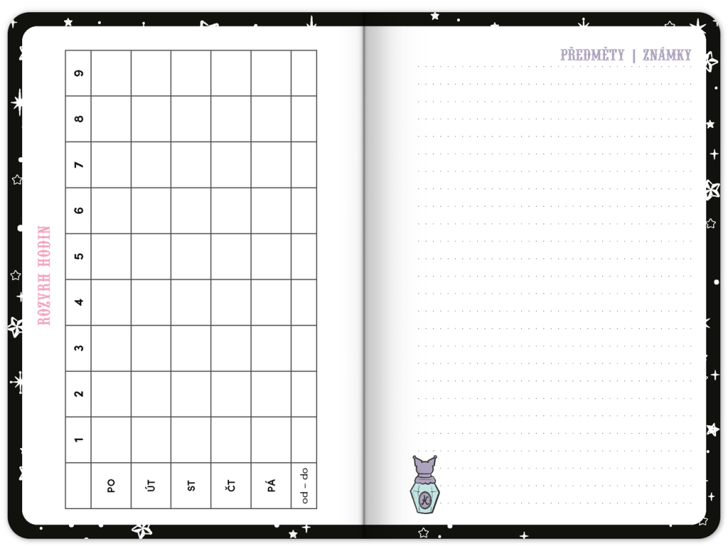 Praktický diář pro všechny větší školáky a studenty s motivem Kuromi. Obsahuje taháky z matematiky, fyziky, chemie a angličtiny. Hodit se budou také rozvrhy hodin a přehled termínů prázdnin.