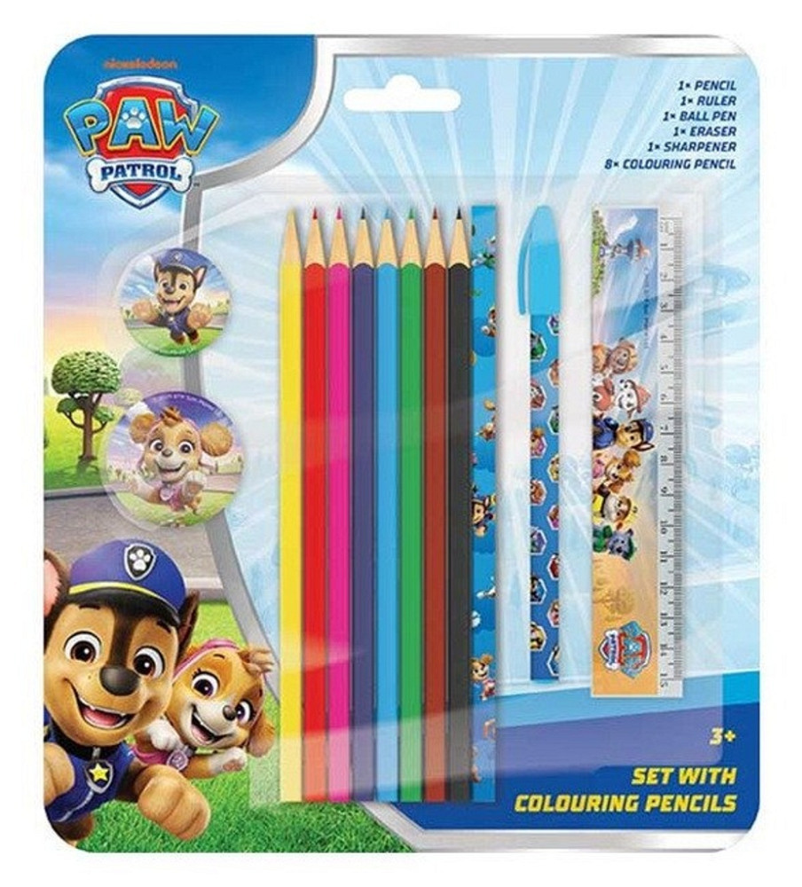 Set obsahuje tužku, propisku, ořezávátko, gumu, pravítko a 8 barevných pastelek.