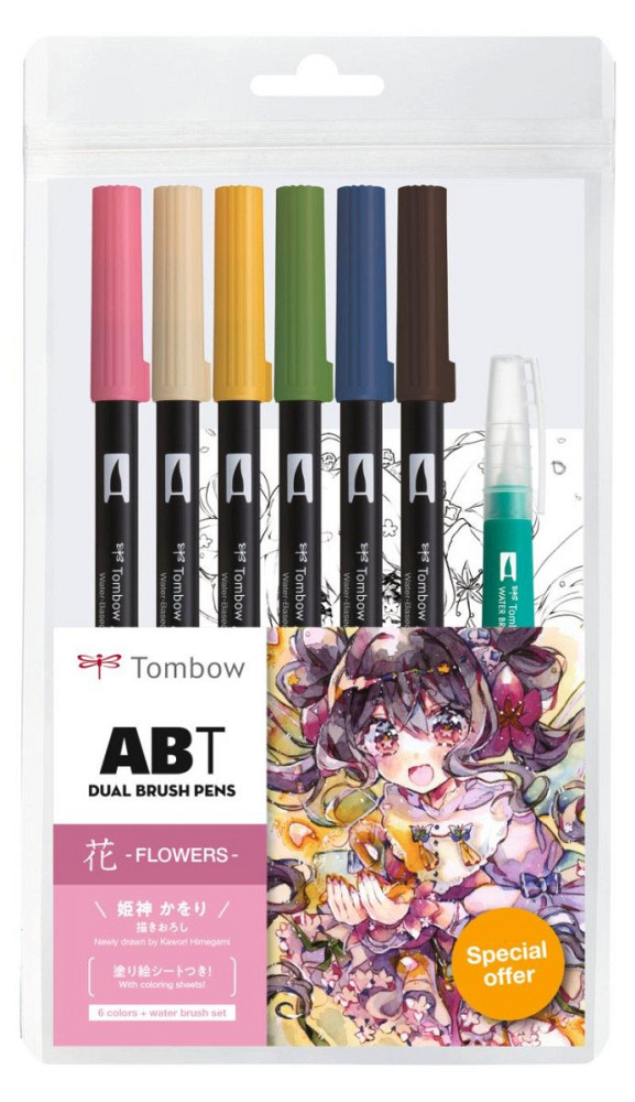 Tombow ABT sada oboustranných fixů Manga Flower 6 ks + vodní štětec