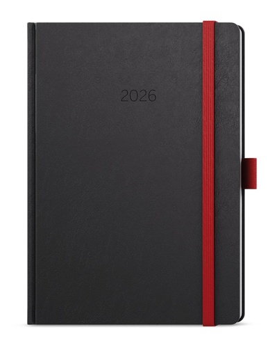 Neobyčejný týdenní diář s matným povrchem ze strukturovaného materiálu s červenou gumičkou a poutkem. Je vyráběný ve formátu A5, má velký prostor pro poznámky a plánování.