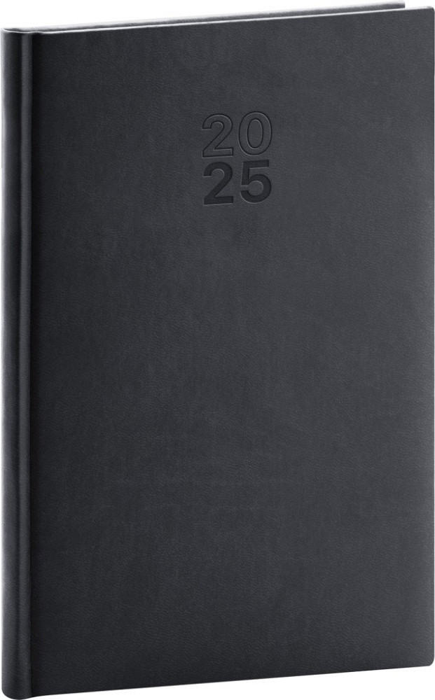 Týdenní diář Aprint 2025 v černé barvě. Nová kolekce vsadila na osvědčené barvy, které doplňuje nová ražba letopočtu. Týdenní rozvrh s česko-slovenským kalendáriem a doplňkovou angličtinou, němčinou, maďarštinou a ruštinou.