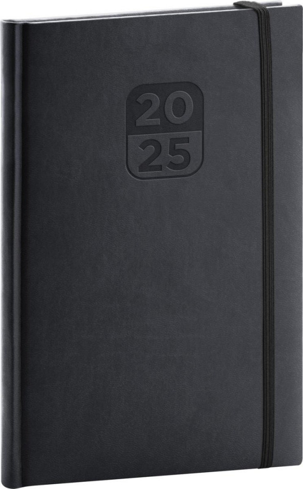Týdenní diář Aprint Top 2025 v černé barvě. Nová kolekce vsadila na osvědčené barvy, které doplňuje nová ražba letopočtu. Týdenní rozvrh s česko-slovenským kalendáriem a doplňkovou angličtinou, němčinou, maďarštinou a ruštinou.