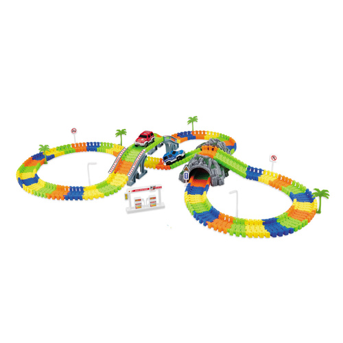 Variabilní dráha s tunelem – nekonečná zábava pro malé závodníky! Tato variabilní dráha se 192 díly nabízí nekonečné možnosti kreativního stavění! S tunely, přemostěním a dlouhou závodní tratí si děti užijí hodiny napínavých závodů. Vlastnosti: Délka dráhy: 285 cm, šířka kolejnice: 7,8 cm Obsah balení: 192 dílů dráhy, 1 autíčko, tunel a přemostění Dvě varianty autíček: červené a modré Snadné sestavení a možnost rozšíření díky kompatibilitě s některými dalšími produkty Pro provoz jsou potřeba 2× 1,5V AA baterie (nejsou součástí balení).