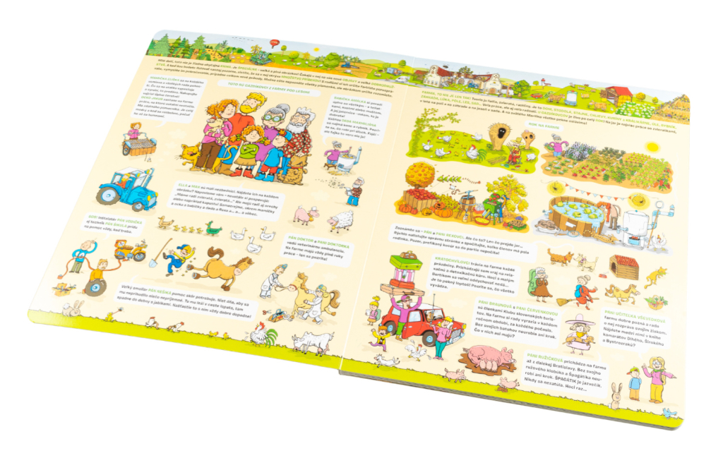 Táto obrázková knižka predstavuje rodinu Sedláčkovcov z farmy pod lesom, kde je živo celý rok! Starajú sa tu o zvieratá a rastliny, a tiež o dom, stajne, chlieviky, kurníky, králikárne, rybník, záhrady, lúky, polia, lesy, sad. Okrem Sedláčkovcov, ktorí na farme urobia najväčší kus práce, sa zoznámite aj s veterinármi, technikmi a ďalšími pomocníkmi, ale i s pravidelnými návštevníkmi farmy, ktorí si sem chodia odpočinúť či hľadajú blízkosť prírody, tradície alebo zábavu počas slávností. Získate ucelený pohľad na hospodársky rok od jari do zimy: na jar je najviac práce so zvieratkami, v lete na poli a v záhrade a na jeseň v sade. A na svätého Martina je potrebné všetko poriadne osláviť!