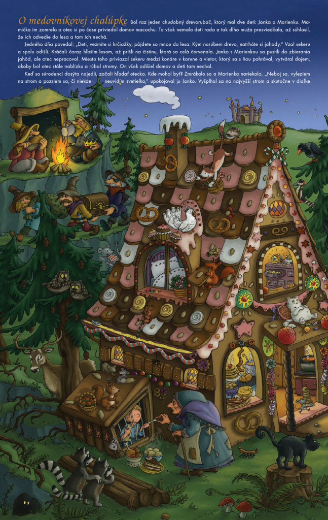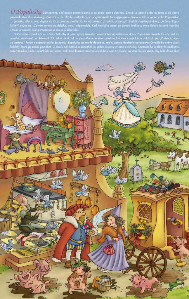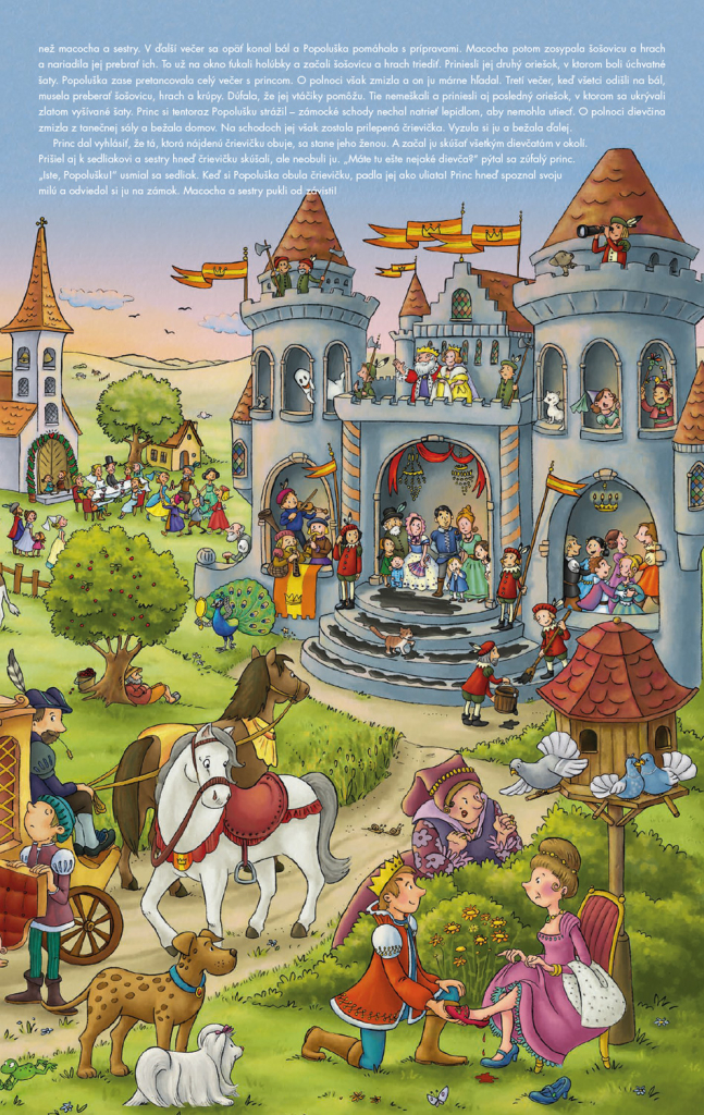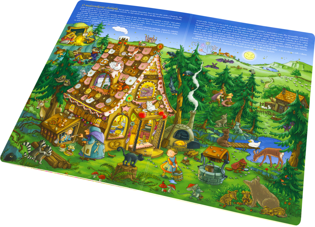 Kromě napínavých dobrodružství hlavních hrdinů tu lze objevit také spoustu drobných příhod dalších pohádkových postav, tvorů a netvorů. Stačí jen otevřít knihu, ponořit se do pohádkového světa a začít ho objevovat. Tak hurá do toho! Pomůžete princi najít ve spícím zámku se spoustou komnat a tajemných zákoutí spanilou Růženku? A dokážete podle obrázků převyprávět všechny udatné činy statečného krejčíka? Nebudete se bát v tajemném nočním lese, kde ježibaba v perníkové chaloupce vězní Jeníčka a Mařenku? A co takhle v chaloupce u lesa, kam se vydáte s Červenou karkulkou? Nenechte se zmást všemi těmi dovádějícími a rozesmátými zvířátky, kterých je plný kraj, a dávejte pozor, koho najdete v babiččině posteli! Ostražitost bude třeba i u sedmi trpaslíků – na Sněhurku má totiž spadeno zlá macecha a usiluje jí o život. Ještě že v pohádkách vždycky dobro zvítězí nad zlem! O tom by mohla vyprávět i Popelka – nebo to raději zkusíte vy, malí čtenáři?