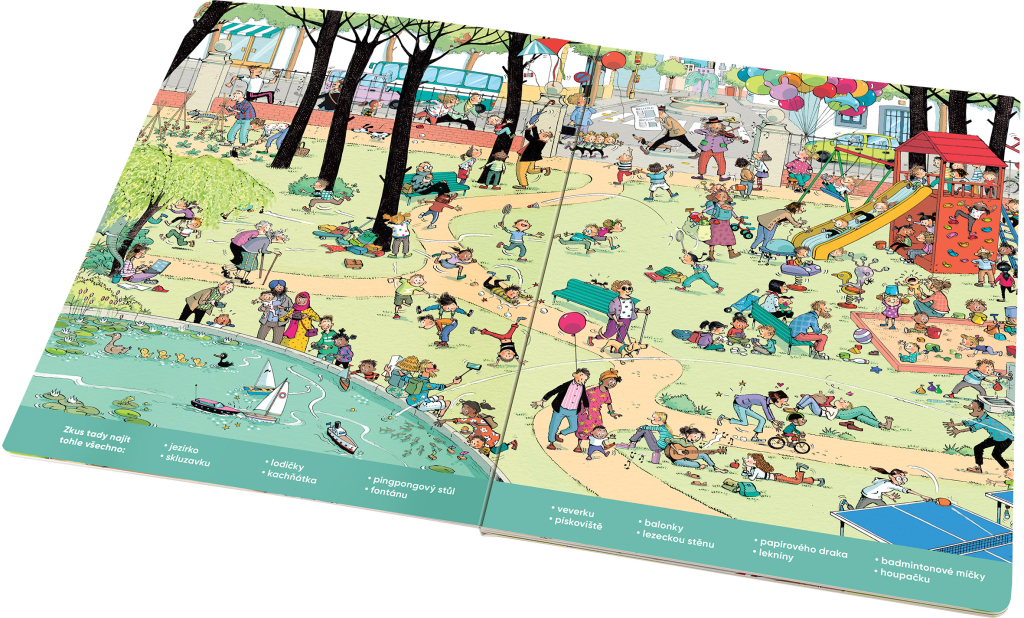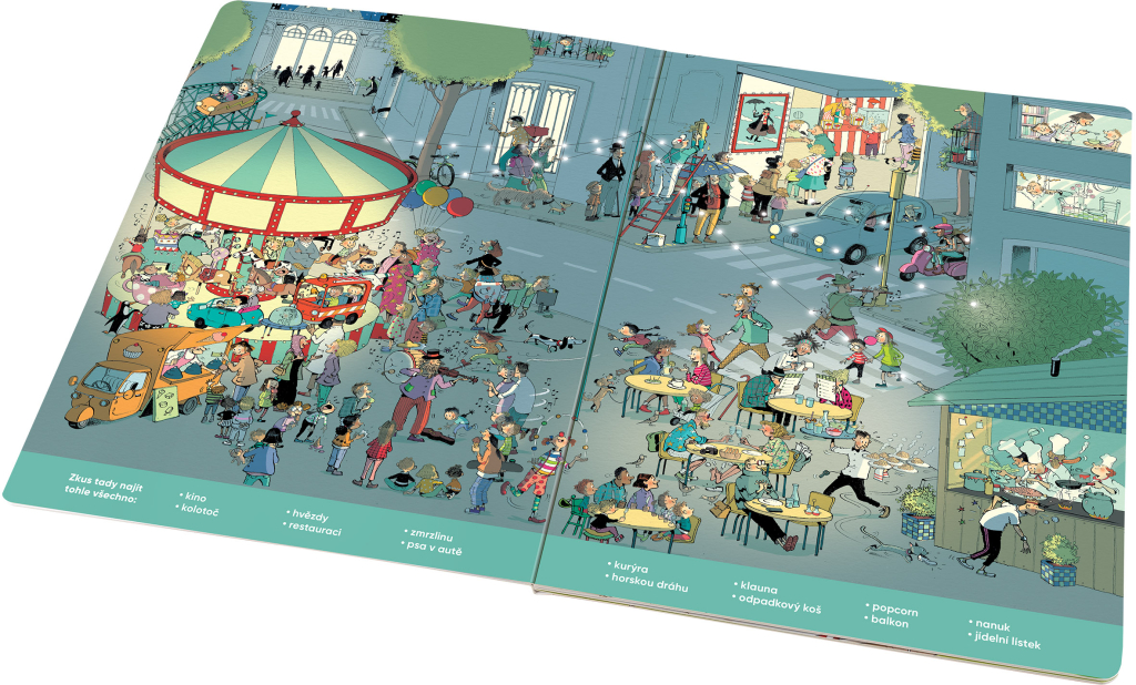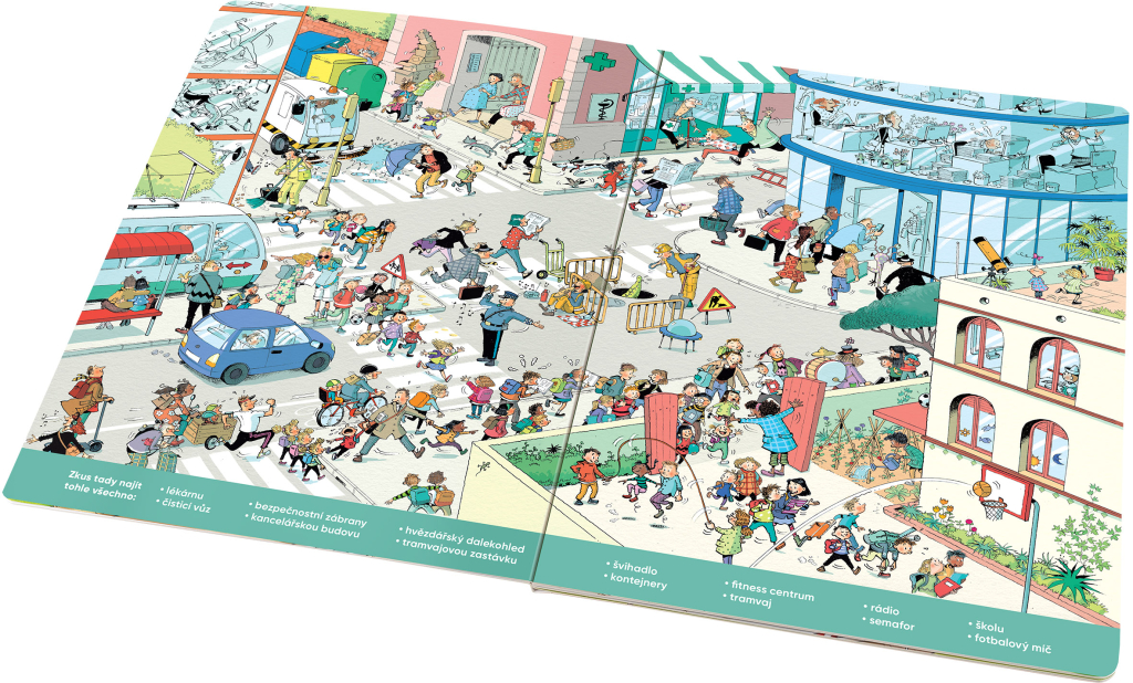 S touhle knížkou o tom, co všechno se děje ve MĚSTĚ, si užijete hodiny a hodiny zábavy! Budete pozorně sledovat, co se kde šustne, v průběhu celého dne. Objevíte tu spoustu příběhů s dobrým koncem, ale i řadu neslavných příhod. Mějte oči na stopkách! Každá stránka je plná detailních barevných obrázků, v nichž lze donekonečna objevovat vždy nové a nové věci, vtípky, postavy i jejich dobrodružství. Řada z nich je úplně obyčejných, ale mnohé jsou tak neobvyklé, že je lze spatřit nebo prožít právě jen na stránkách tohohle krásného velkoformátového leporela.