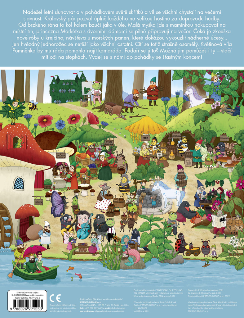 Nadešel letní slunovrat a ve světě skřítků a víl se všichni chystají na slavnost. Královský pár pozval úplně každého na velikou hostinu za doprovodu hudby. Od brzkého rána to kol kolem bzučí jako v úle a celá pohádková vesnička je na nohou v radostném očekávání slavnostního večera. Jen hvězdný jednorožec se netěší jako všichni ostatní. Cítí se totiž strašně osamělý. Naštěstí je tu květinová víla Pomněnka, která si předsevzala, že mu pomůže najít kamaráda. Podaří se jí to? Pokud budete mít oči na stopkách, možná jim dokážete pomoct i vy!