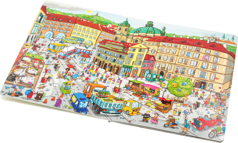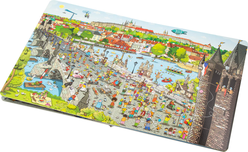 Velká knížka PRAHA. Jako modrý had se mezi pražskými kopci vine řeka Vltava překlenutá mnoha mosty a lávkami. Tím nejstarším, nejkrásnějším a nejznámějším je KARLŮV MOST. O letních prázdninách je na mostě pěkná tlačenice! Z mostu je překrásný pohled na Pražský hrad. Hrad je obrovský! Patří k největším na světě. Vydáme-li se tím směrem, nemůžeme minout MALOSTRANSKÉ NÁMĚSTÍ s chrámem svatého Mikuláše. I tam je pěkně rušno, obzvláště když po studené zimě vykoukne jarní sluníčko. A půjdeme-li z mostu na druhou stranu, dorazíme do centra města – na nejstarší a nejvýznamnější náměstí Prahy – STAROMĚSTSKÉ NÁMĚSTÍ s krásnou radnicí a magickým orlojem. A když přicházejí Vánoce, to je teprve kouzlo! Ale Praha, to nejsou jen domy, mosty a chrámy. Tak například STROMOVKA, to je jedno velké hřiště a nejen pro děti...!