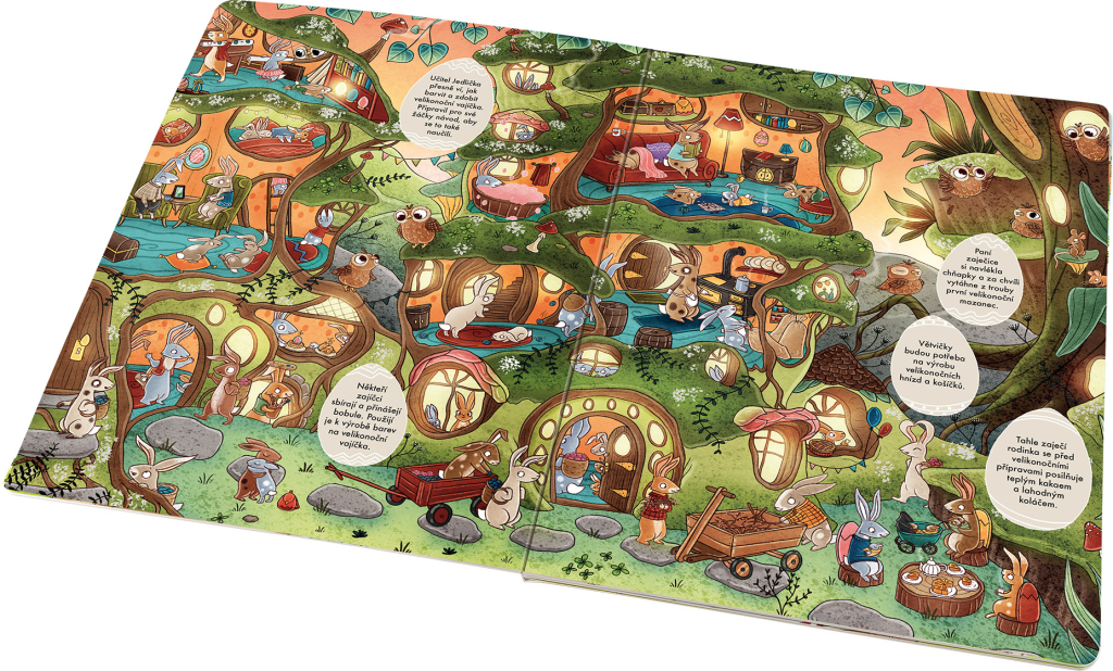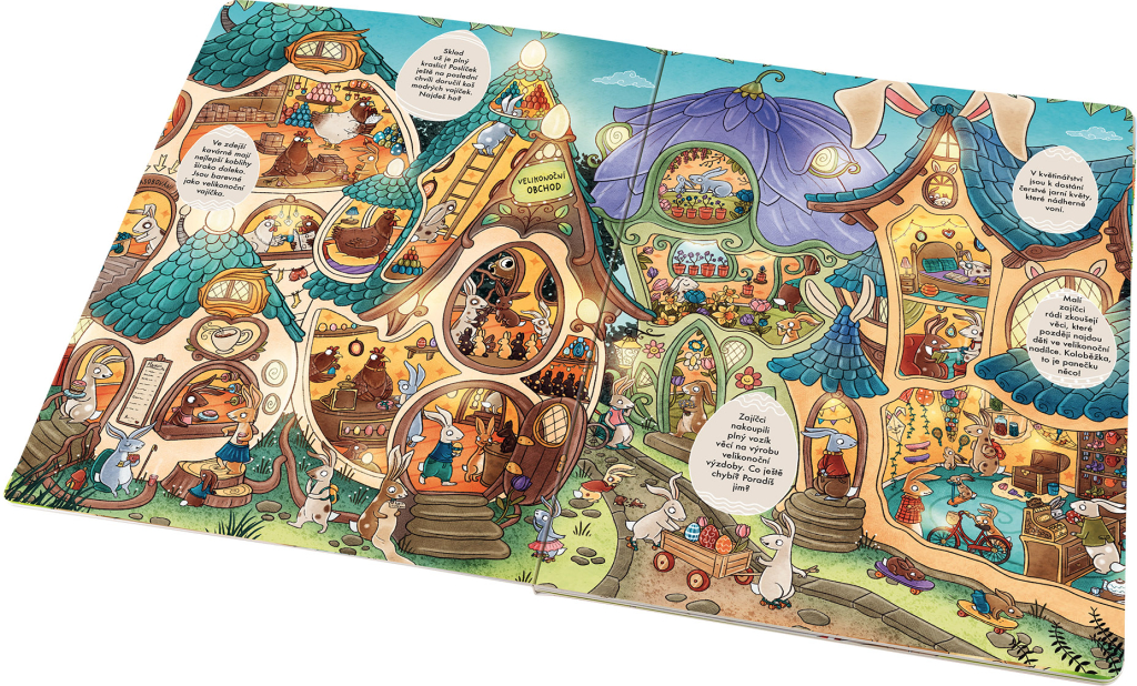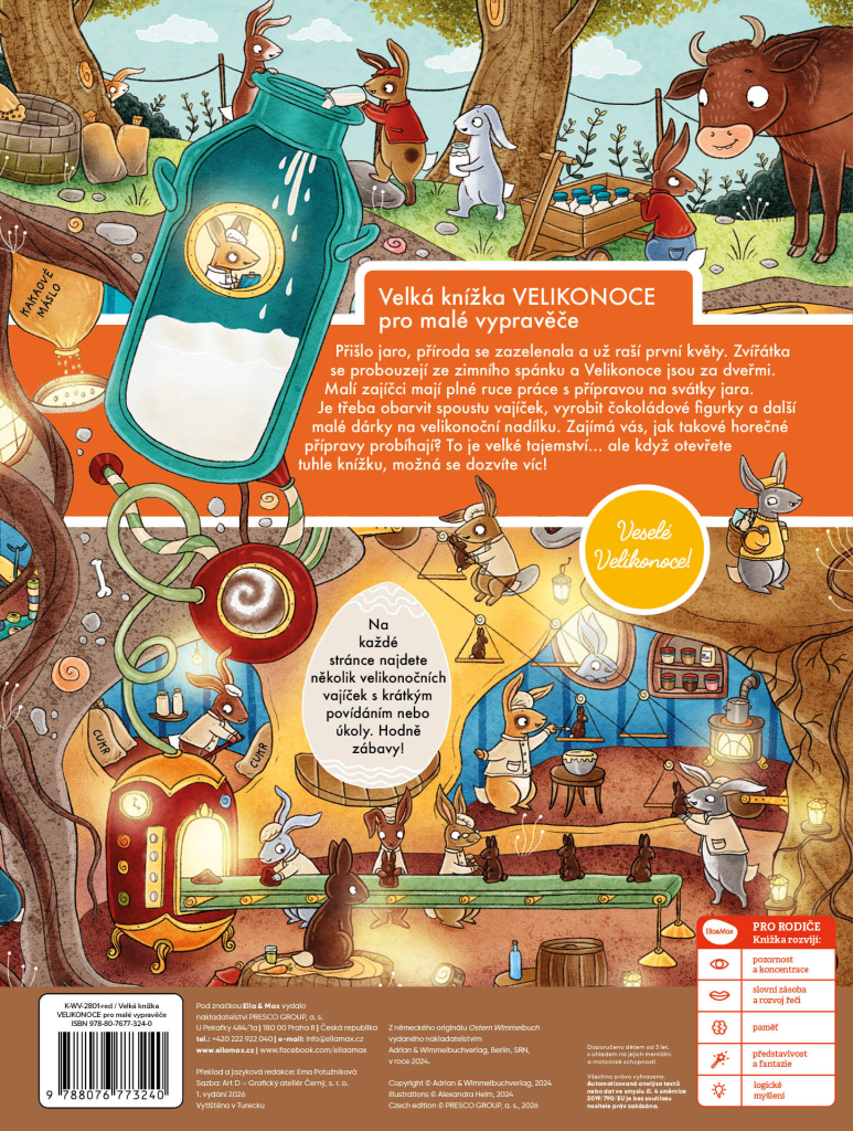 Přišlo jaro, příroda se zazelenala a už raší první květy. Zvířátka se probouzejí ze zimního spánku a Velikonoce jsou za dveřmi. Malí zajíčci mají plné ruce práce s přípravou na svátky jara. Je třeba obarvit spoustu vajíček, vyrobit čokoládové figurky a další malé dárky na velikonoční nadílku. Zajímá vás, jak probíhají takové horečné přípravy v pohádkovém světě? To je velké tajemství… ale když otevřete tuhle knížku, možná se dozvíte víc! Na každé stránce najdete několik velikonočních vajíček s krátkým povídáním nebo úkoly. Hodně zábavy!