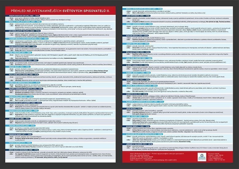 Přehledová tabulka učiva – Přehled světových spisovatelů II. - zpracovaný do přehledného souhrnu. Celkem 37 autorů, jejich život a nejvýznamnější díla pro snadné zapamatování. Tabulka je dobrým pomocníkem do hodiny literatury na druhém stupni základní školy.