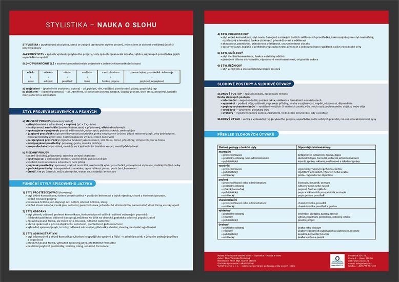 Přehledně zpracovaný přehled slohové výchovy pro žáky druhého stupně základní školy. Styly písemného a mluveného projevu, funkční styly spisovného jazyka - podrobně zpracovaný - prostěsdělovací, administrativní, odborný, publicistický, umělecký a řečnický styl. Podrobně zpracované slohové postupy a útvary.