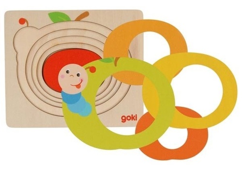 Vícevrstvá vkládačka s motivem jablíčka s housenkou. Skládačka obsahuje pět dílků.