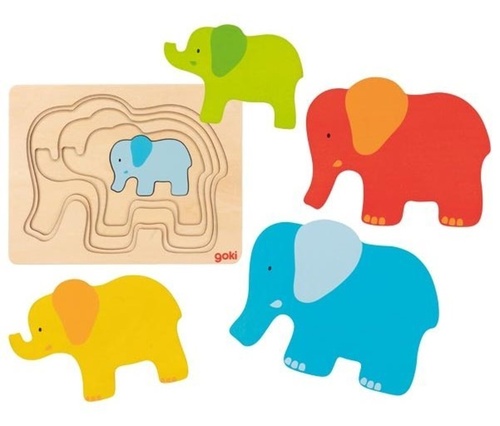 Vícevrstvá vkládačka s motivem barevných slonů. Skládačka obsahuje pět dílků.