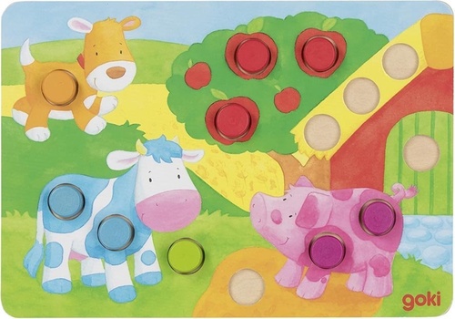 4 barevné dřevěné obrázky (21 x 14,5 x 0,6 cm), 90 barevných kamenů + barevná hrací kostka. Nejprve se děti mohou naučit vkládat barevné kameny do obrázků dle vlastního potěšení a cvičit prstíky a jemnou motoriku. Postupně se naučí rozlišovat barvy a doplňovat kameny do obrázků podle barev. Při hře s kostkou hráči doplňují kameny podle barvy, která padne.