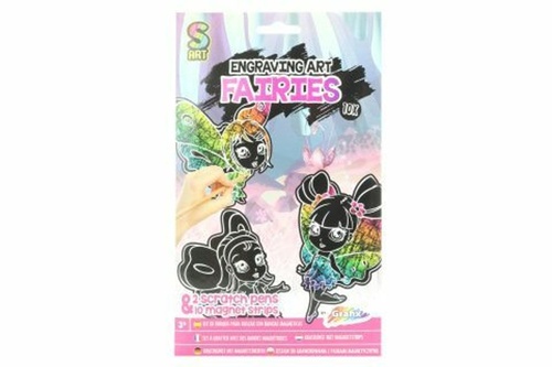 Sada vyškrabovacích obrázků - víly. Balení obsahuje 10 obrázků, 2 škrabací pera a 10 magnetů.