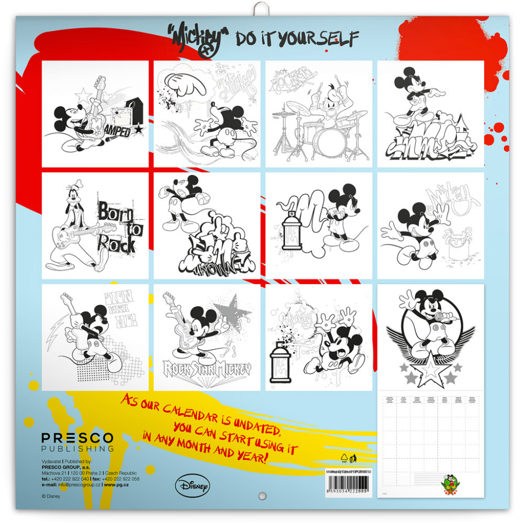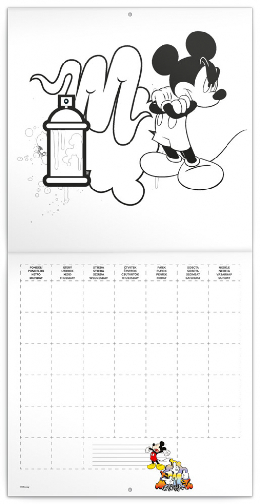Zábavný kalendář pro děti, kde si mohou vymalovat známé postavičky myšáka Mickeyho a jeho přátel, kalendárium: 4jazyčné (CZ, SK, HU, GB) bez letopočtu