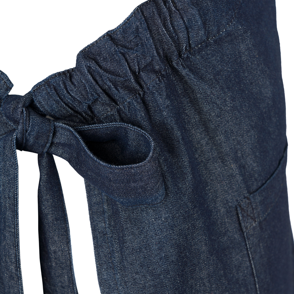 Denimová zástěra z kolekce Kateřiny Winterové, která díky unikátnímu stahovacímu systému padne každé postavě.Zástěra má široká ramínka, která se vzadu kříží, a po stranách velké kapsy.