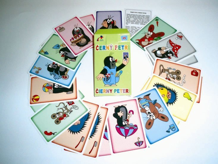 Dětské karty pro hru zvanou "Černý Petr" s obrázky Krtečka - od ilustrátora Zdeňka Milera. Krabička obsahuje i podrobný návod a karty mají na rubové straně mírně zdrsnělý povrch pro lepší manipulaci s nimi.