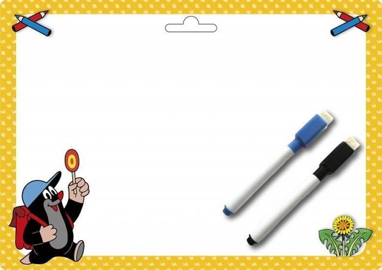 Velikost 21,0 x 29,7 x 1,3 cm, lesklý povrch z lícové i rubové strany, nedílnou součástí výrobku 2x stíratelný popisovač s plstěným hrotem modré a černé barvy, za sucha stíratelná tabulka , slouží k opakovanému kreslení, či psaní z obou stran, na tabulce praktický otvor na zavěšení.