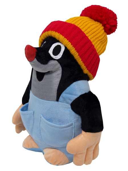 Plyšový Krteček v kalhotkách s kapsami, sundavacím pleteným kulichem. Praní na 40°C.Pro děti bez omezení věku.